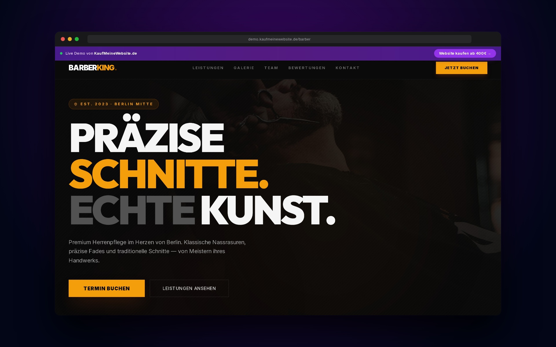 Premium Barber Shop Website mit modernem Dark Design, Animationen, Buchungsformular und Team-Vorstellung. Perfekt für Barbershops, die online professionell auftreten wollen. Inklusive Service-Übersicht, Galerie und interaktivem Buchungssystem.